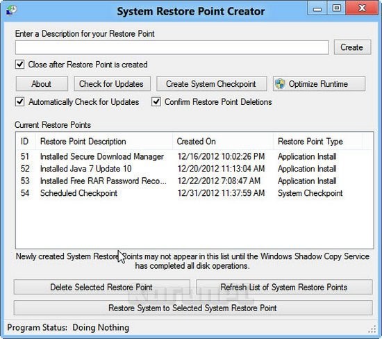 1) Ison päivityksen asentamisen jälkeen on syytä aina manuaalisesti tehdä restore point, palautuspiste. Restore Point Creator täydentää Windowsin omaa järjestelmän palautustoimintoa. Point Creatorilla voi sekä luoda palautuspisteen, poistaa palautuspisteen, tutkia kaikkia palautuspisteitä, että palauttaa järjestelmän ennalleen. Tehty palautepiste otetaan käyttöön vakavissa ongelmissa; tämä on yksi viimeiseistä keinoista estää käyttöjärjestelmän korruptoituminen ja käyttiksen uudelleen lataus.