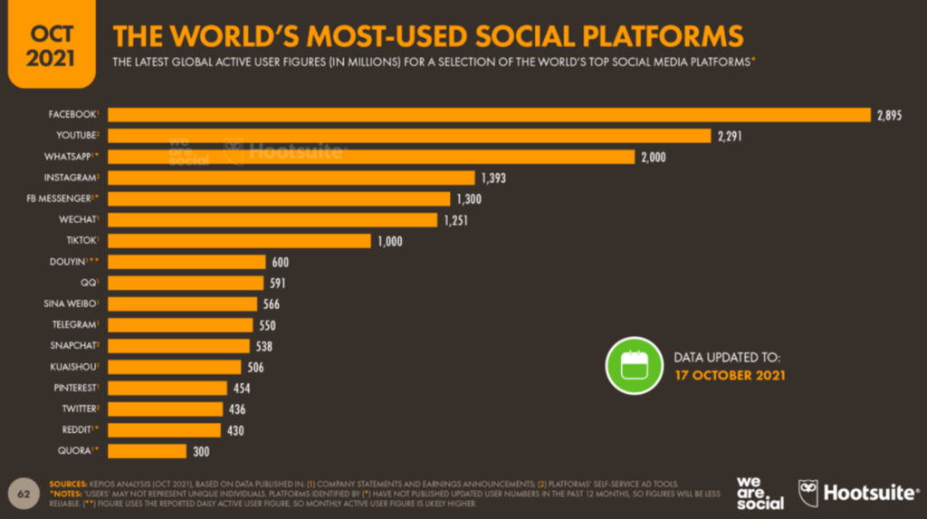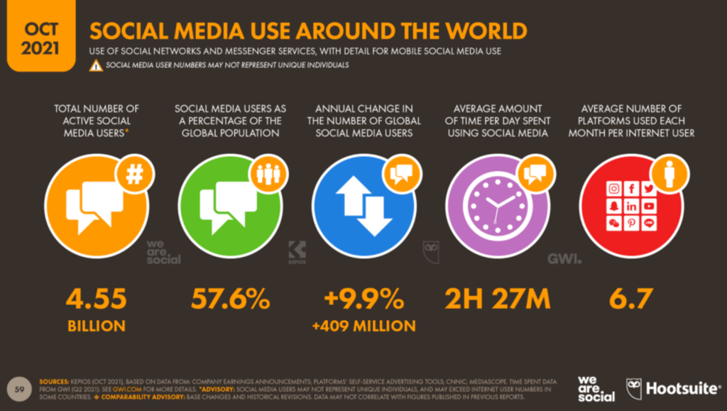 Vuoden 2021 some kasvoi entisestään, mikä ei liene yllätys monellekaan. Somen kokonaiskäyttäjämäärä maailmassa on 4,55 biljoonaa, eli noin 57,6 % koko maailman väestöstä. Joten, jos vielä pohdit miksi yrityksiäkin kannustetaan olemaan somessa tässä vastauksesi.